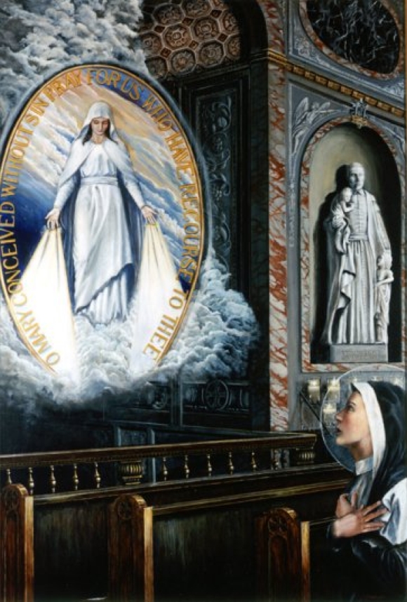 Sokgyermekes családban látta meg a napvilágot Labouré Katalin 1806.máj.2-án, aki édesanyját hamar elveszítette. 1830 áprilisában belépett azt Irgalmas nővérekhez Párizsba. 1876. december 31-én adta vissza a Teremtőnek a lelkét. Teste épen marad és az Irgalmas nővérek templomában nyugszik Párizsban. 1933-ban boldoggá, majd 1947. július 27-én szentté avatták. Már a novícia ideje alatt megkezdődtek a látomásai az Eucharisztia Jézusáról, ami azt a vágyat ébresztette benne, hogy láthassa a Szűzanyát is, ami 1830.júl.19-én teljesült. 1830.november 27-én ismét megjelent neki a Szűzanya, félgömbön állva, a lábai alatt pedig egy eltaposott kígyó volt látható. Kezében gömb, tetején aranykereszttel, ujjain gyűrűk, aminek köveiből csodás fény sugárzott. A látomás alatt pedig ezeket hallotta: ,,Ez a gömb, amelyet látsz, nemcsak az egész világot ábrázolja, hanem Franciaországot és minden embert külön-külön is.” A kövekből előtörő sugarakról pedig megjegyezte: ,,Azoknak a kegyelmeknek a jelképei ezek, amelyeket kiárasztok mindenkire, aki csak kéri tőlem.” Voltak olyan kövek is, amelyekből nem sugárzott fény, ezek pedig azok a kegyelmek voltak, amelyeket senki nem kért. A látomás megváltozott. Leeresztett fénysugarakat árasztva tárultak a karjai a Föld felé. Az alakja köré ovális keretben aranybetűkkel a következő szöveg volt: „Ó, bűn nélkül fogantatott Szűz Mária, könyörögj érettünk, kik hozzád menekszünk!”