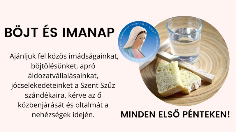 A Mária Rádió Világcsaládja minden hónap első péntekére ima és böjtnapot hirdetett. Rendkívüli időket élünk és ez egy rendkívüli lehetőség, hogy felajánljuk imánkat és böjtünket Mária Szeplőtelen Szíve szándékaira.