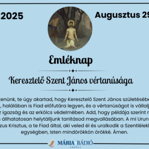 Keresztelő Szent János vértanúságára emlékezünk augusztus 29-én. Az ünnep neve: Szent János fővétele (Decollatio S. Johannis Baptistae). A keleti egyház Keresztelő Szent János iránti tisztelete nyilvánul meg abban is, hogy...